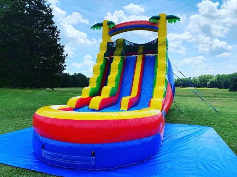 Always use ground stakes and the included tie down straps to secure the waterslide to the ground. Additional securing methods such as sandbags may be required depending on the set up area.