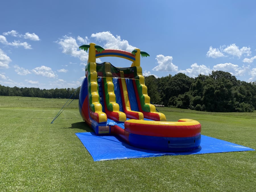 This waterslide is made of 100% Commercial grade 15 ounce PVC Vinyl with attached pool.