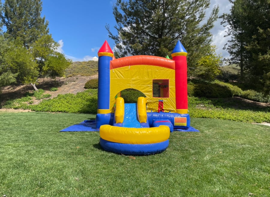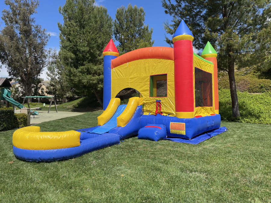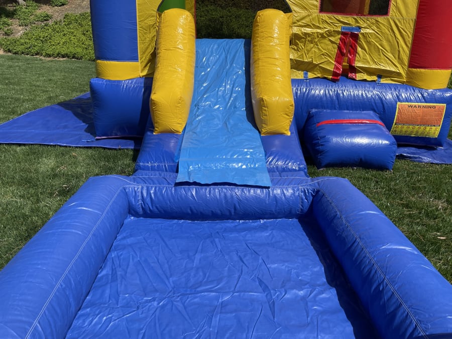 The pool is detachable, allowing the unit to function as a bounce house combo slide. The free slippery slide cover allows for easy sliding, even when using as a dry unit. The pool attaches to the combo bounce house unit by the flap underneath the slide, so only 1 blower is needed to inflate both units. The sprinkler hose connects to any standard 1/2" garden hose and there is a Velcro like attachment point for the sprinkler end of the hose above the arch.