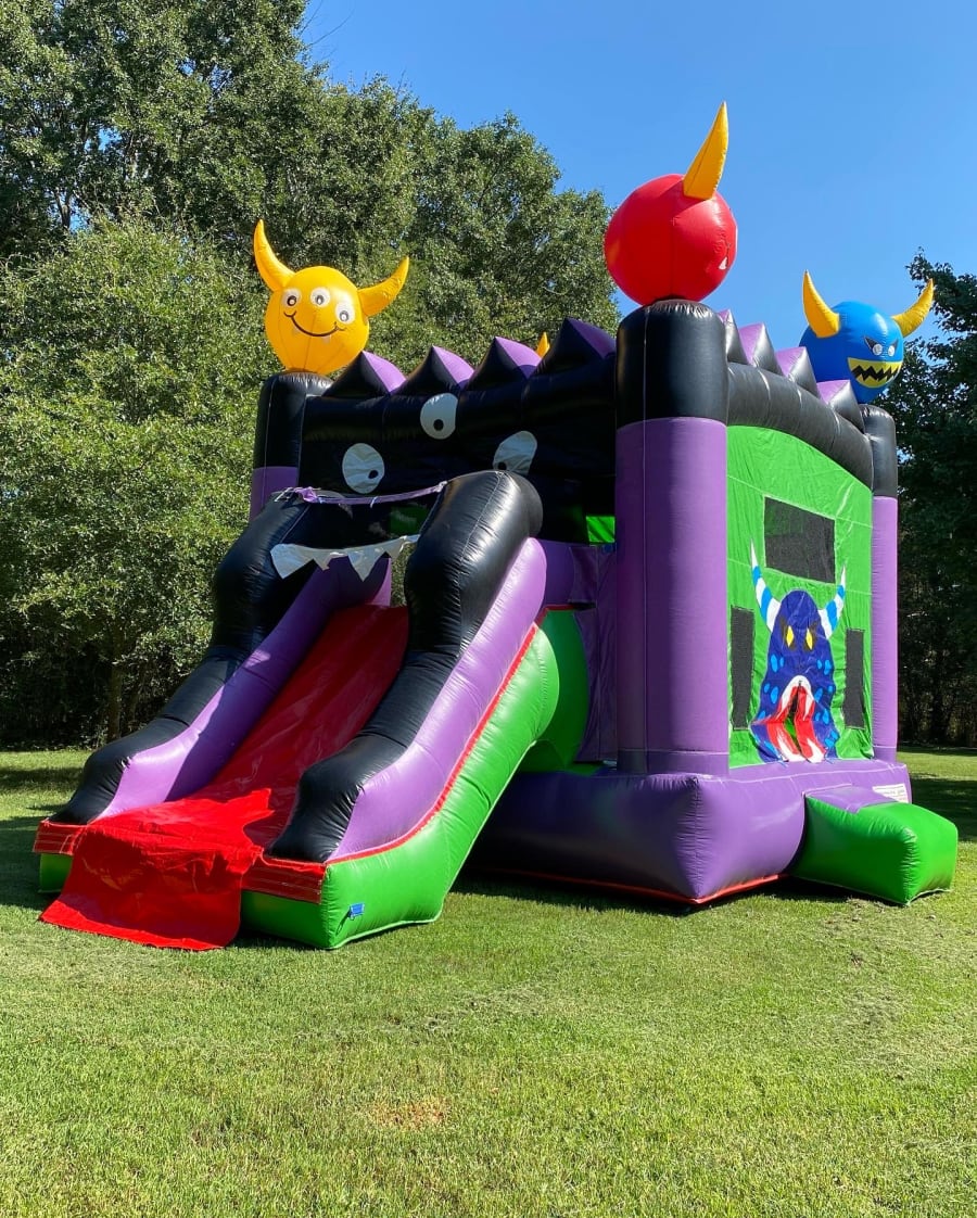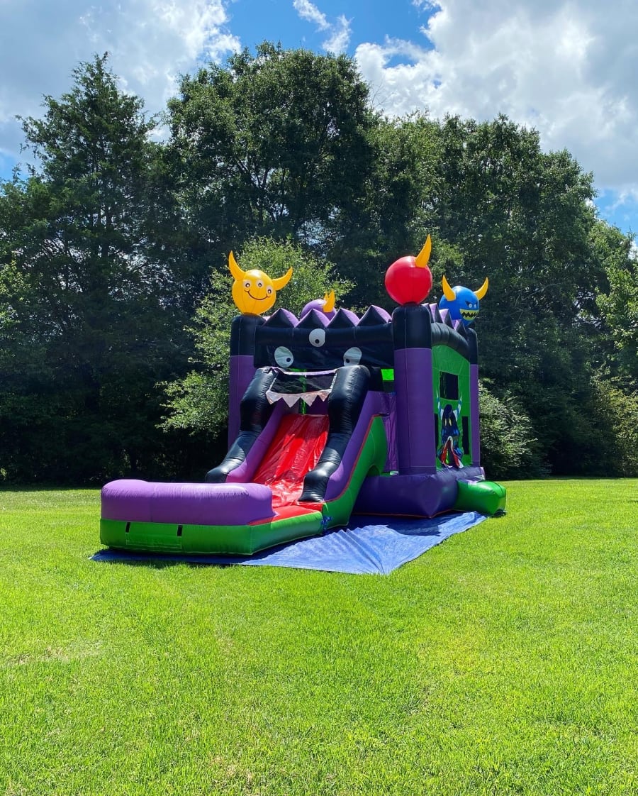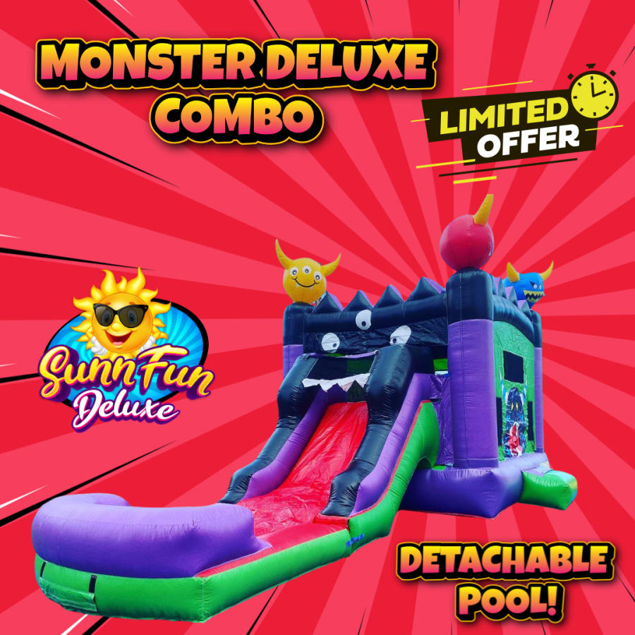 5 IN 1 Upgraded Monster Deluxe Combo. The pool is detachable, allowing the unit to function as a bounce house combo slide. The free slippery slide cover allows for easy sliding, even when using as a dry unit. The pool attaches to the combo bounce house unit by the flap underneath the slide, so only 1 blower is needed to inflate both units. The sprinkler hose connects to any standard 1/2" garden hose and there is a Velcro like attachment point for the sprinkler end of the hose above the arch.