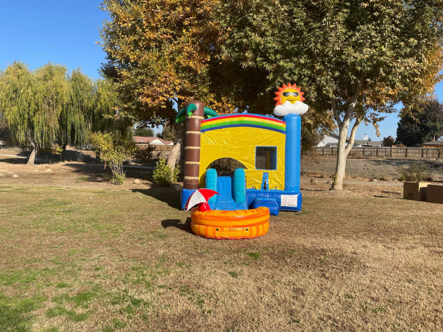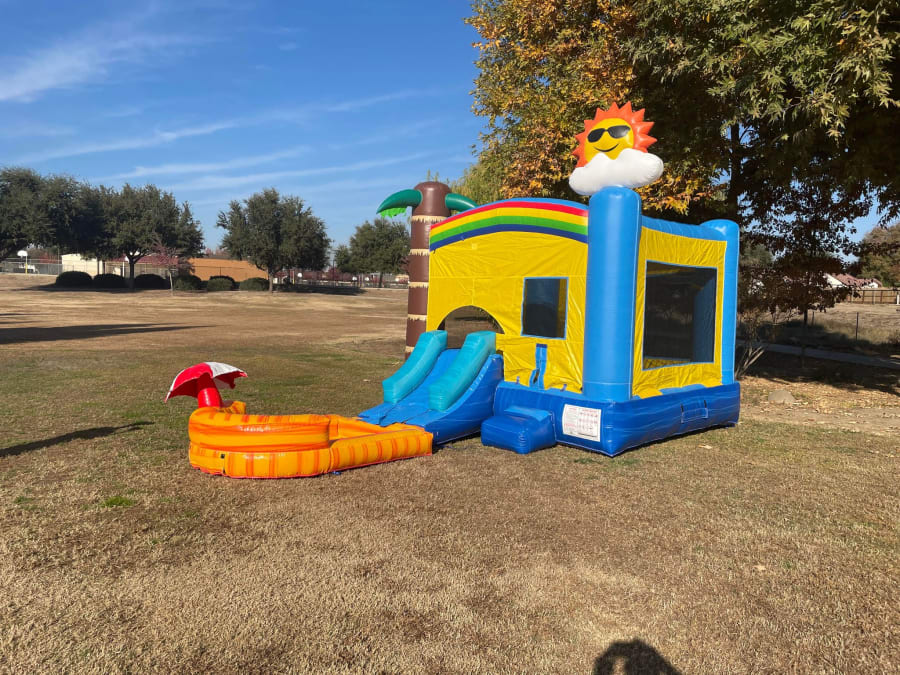 The pool is detachable, allowing the unit to function as a bounce house combo slide. The free slippery slide cover allows for easy sliding, even when using as a dry unit. The pool attaches to the combo bounce house unit by the flap underneath the slide, so only 1 blower is needed to inflate both units. The sprinkler hose connects to any standard 1/2" garden hose and there is a velcro like attachment point for the sprinkler end of the hose above the arch.