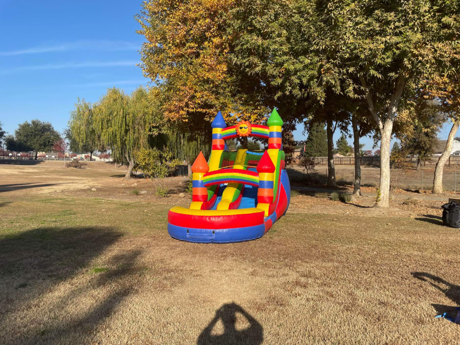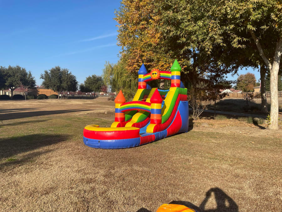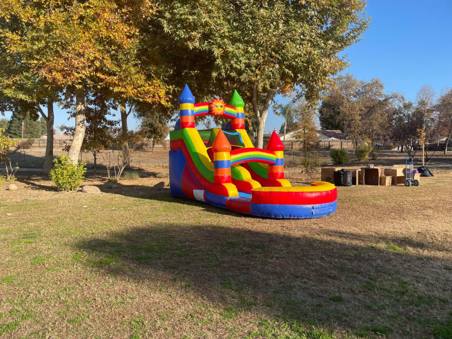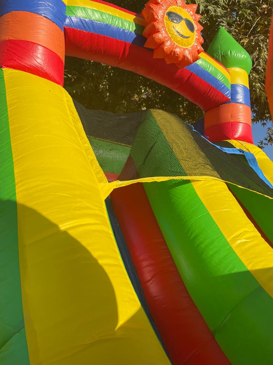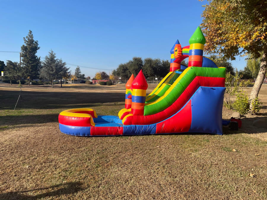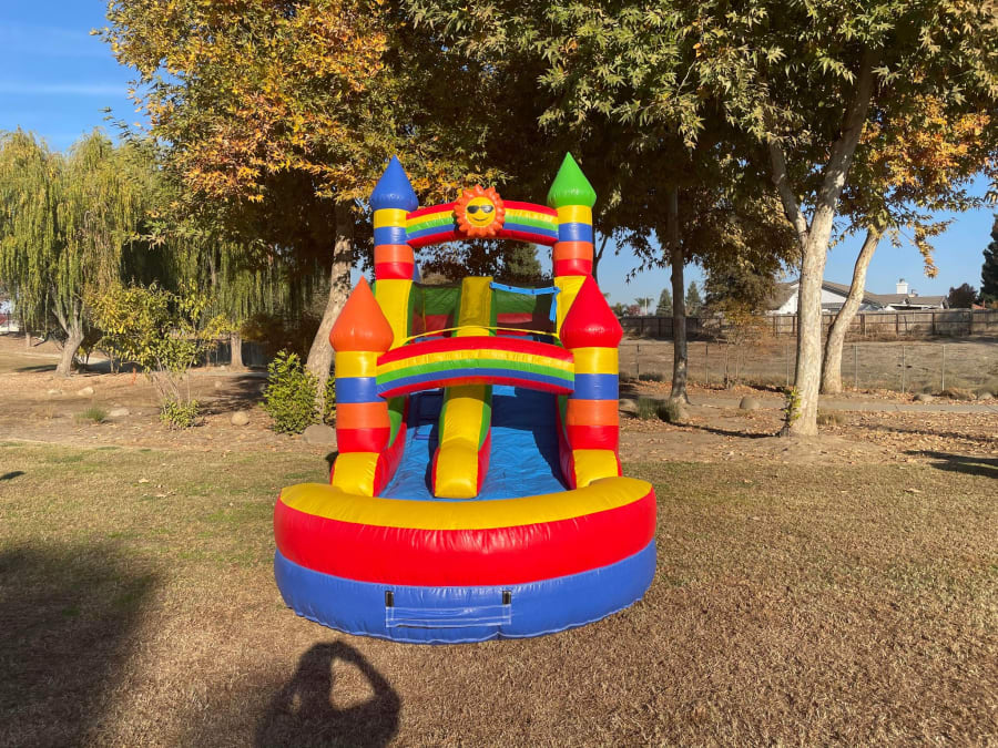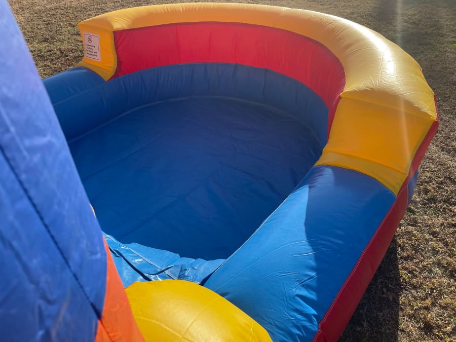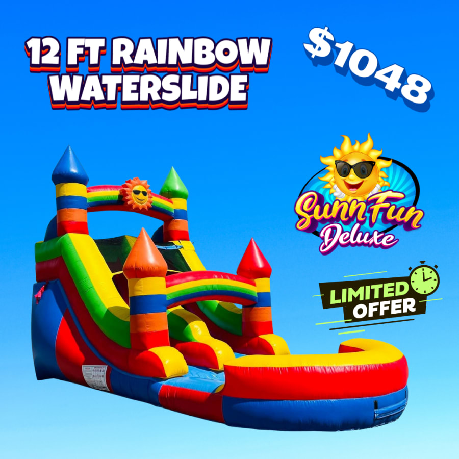This 12 Ft Deluxe Waterslide is 9 feet wide by 21 feet long base dimensions, 12 feet to the top of the towers, 6 feet high slide platform with an overhead mesh shade roof.