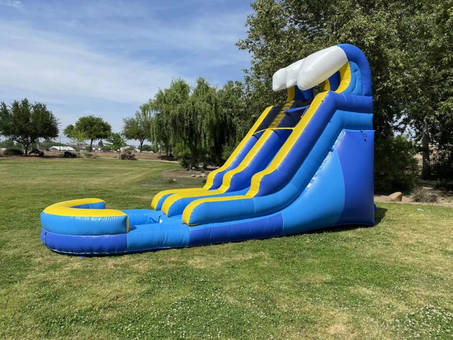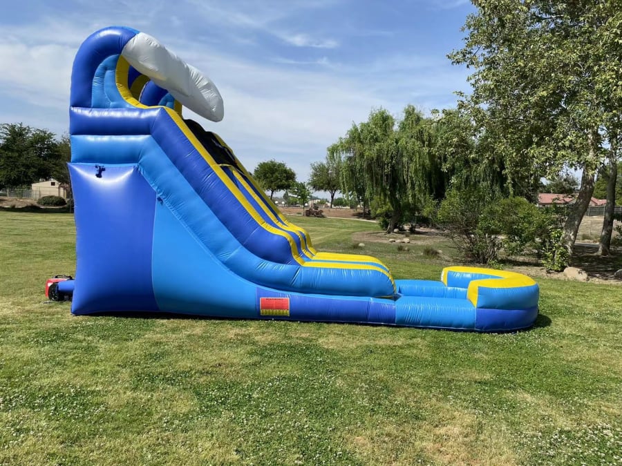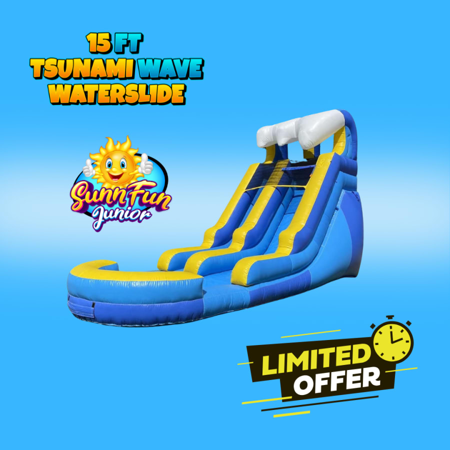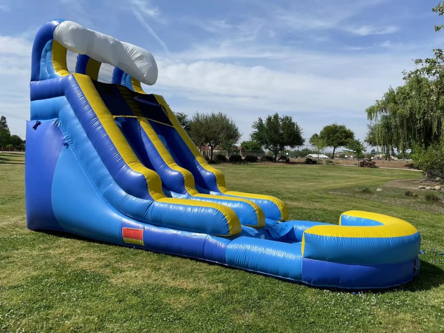 This 15 Ft Waterslide is 9 feet wide by 25 feet long base dimensions, 15 feet to the top of the towers, 9 feet high slide platform with an overhead mesh shade roof.