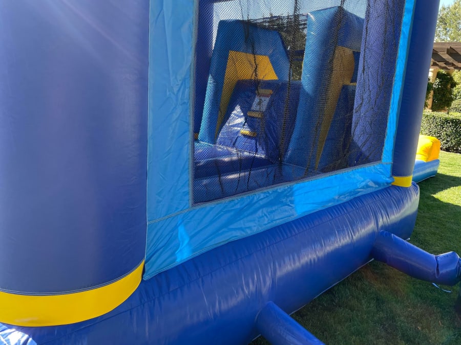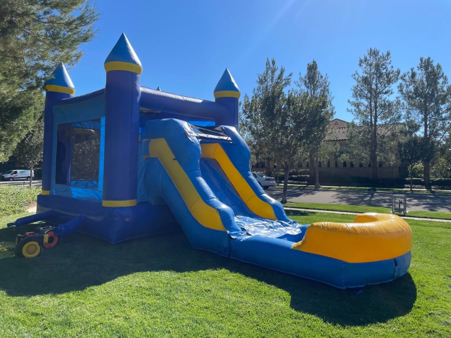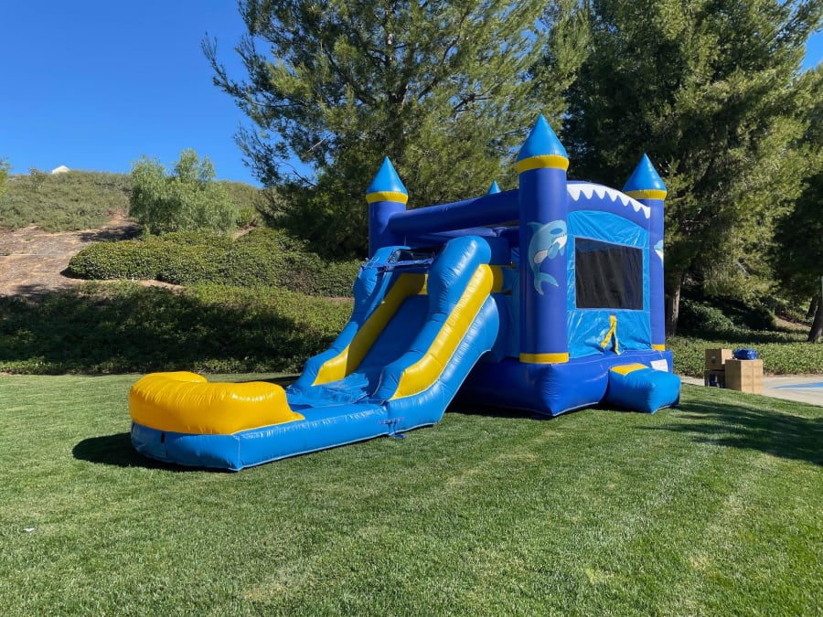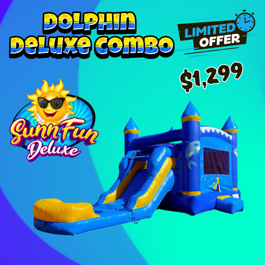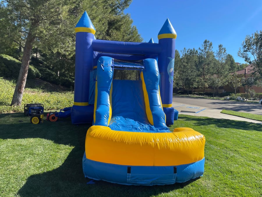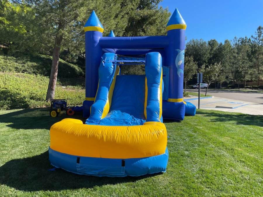 5 IN 1 Dolphin Deluxe Combo. The pool is detachable, allowing the unit to function as a bounce house combo slide. The free slippery slide cover allows for easy sliding, even when using as a dry unit. The pool attaches to the combo bounce house unit by the flap underneath the slide, so only 1 blower is needed to inflate both units. The sprinkler hose connects to any standard 1/2" garden hose and there is a Velcro like attachment point for the sprinkler end of the hose above the arch.